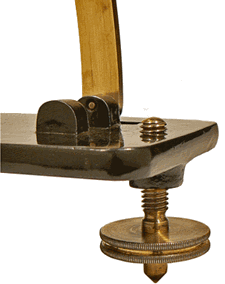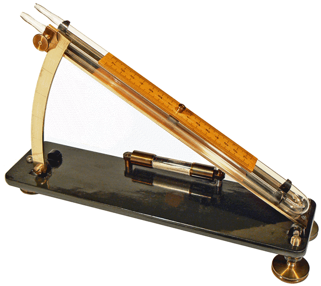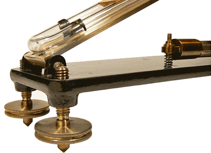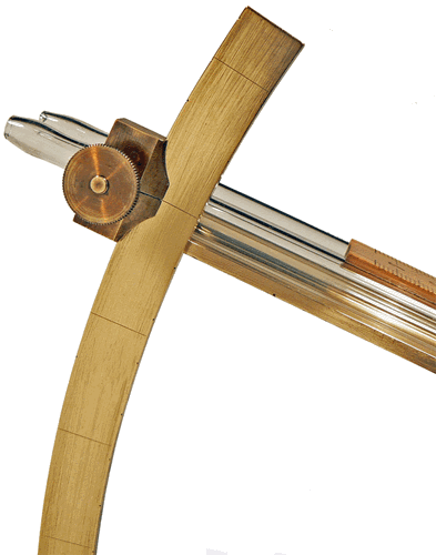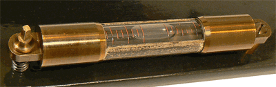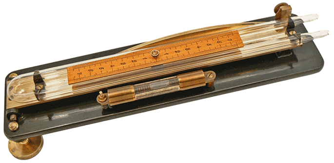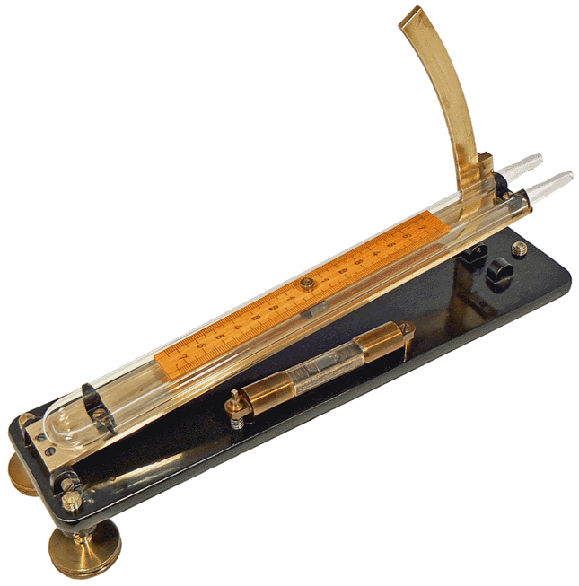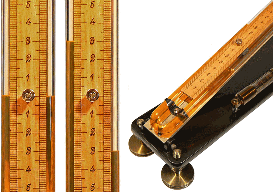 Une règle en buis portant une double graduation montante et descendante indique la différence des niveaux dans les deux branches du tube. Cette règle peut se déplacer longitudinalement pour permettre le réglage initial de la position "zéro" de la double colonne de liquide. |