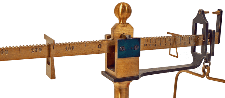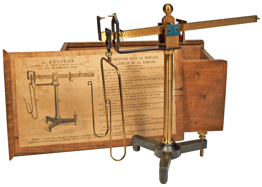 C'est une balance de type romaine. Deux masselottes formant curseurs se déplacent de part et d'autre du couteau, axe de rotation du fléau. En l'absence de charge, le fléau est à l'horizontale lorsque les deux curseurs sont, le grand sur le "zéro" des dizaines et le petit sur le "zéro" des unités. |