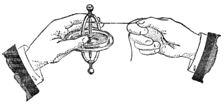 En tirant énergiquement sur la fine et solide ficelle enroulée sur l'axe, on imprime à la toupie un mouvement circulaire rapide. Si on conserve le gyroscope "lancé" en le tenant par les deux petites sphères qui terminent les vis en laiton, on constate une résistance aux changements d'orientation qu'on lui imprime manuellement. On peut aussi poser l'appareil en rotation par l'une des têtes sphériques, par exemple sur une surface plane, et suivre ses évolutions. C'est le cas sur la photographie de gauche, |
