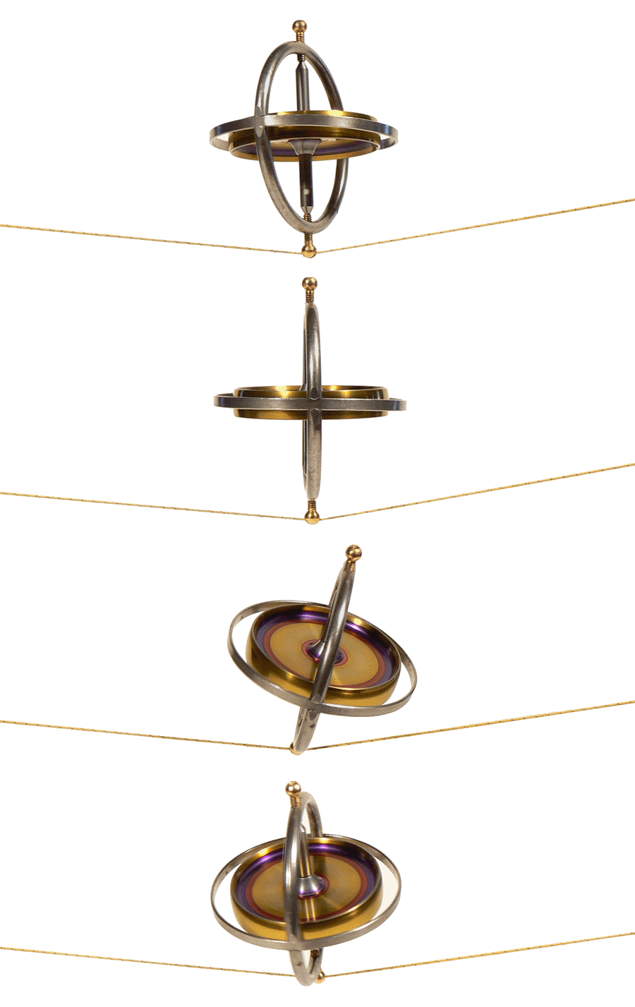 Sur les deux photographies qui suivent, le gyroscope en rotation est simplement posé, par l'une de ses vis à tête sphérique, à l'intérieur de la boucle d'un fil : contrairement à toute attente, il ne tombe pas et son axe conserve la même inclinaison en tournant lentement autour du fil : c'est le phénomène de précession. |