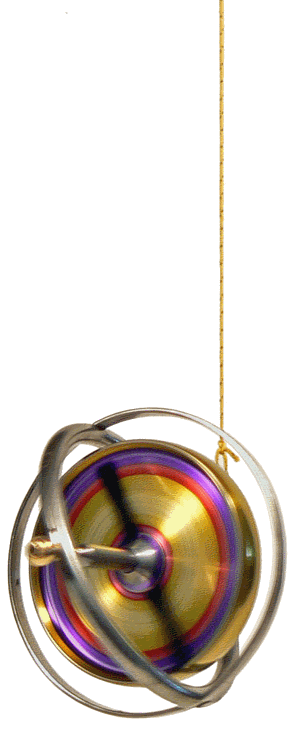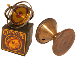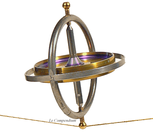 Les propriétés du gyroscope sont mises à profit dans de nombreuses circonstances nécessitant le maintien de la position axiale d'un objet ou d'un dispositif. Le gyroscope est utilisé, par exemple, dans la construction des pilotes automatiques et des compas gyroscopiques. Il est présent, aujourd'hui, dans le support de certaines caméras "de poing" qu'il permet de stabiliser lors de la prise de vues. Le gyroscope, sous une forme plus élaborée que celle de notre modèle, à été imaginé en 1852 par J.-B.-L. FOUCAULT, physicien français, afin de mettre en évidence le mouvement de rotation de la Terre. On lui devait déjà la fameuse expérience du pendule suspendu sous la coupole du Panthéon en 1851, réalisée pour le même objet. |