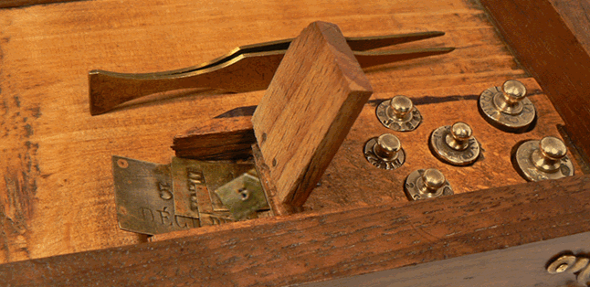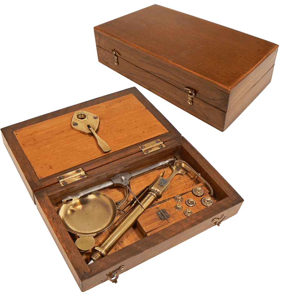 Le coffret de 17,5 x 10 x 4,5 cm contient les éléments d'un petit trébuchet sur colonne, à levier ou pédale. L'instrument est facilement transportable et il est très rapidement utilisable comme un trébuchet de table. |