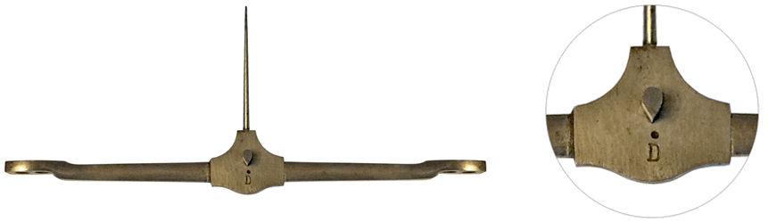 Le flléau en acier de 13 cm est frappé, sous l'arête du couteau central, d'un D surmonté d'un point. Il peut s'agir de la marque de Lucien Dabat, balancier à Vincennes et inscrit au registre des fabricants de poids et mesures en 1938. |