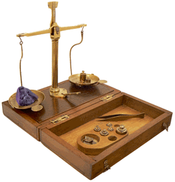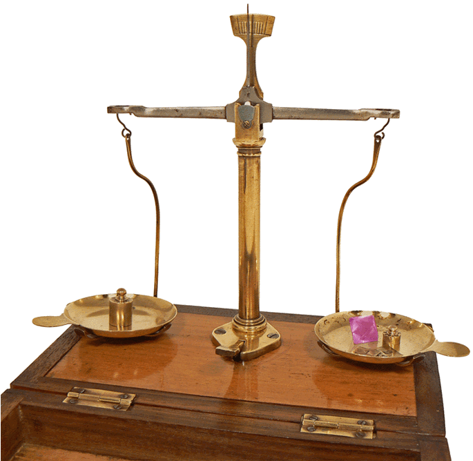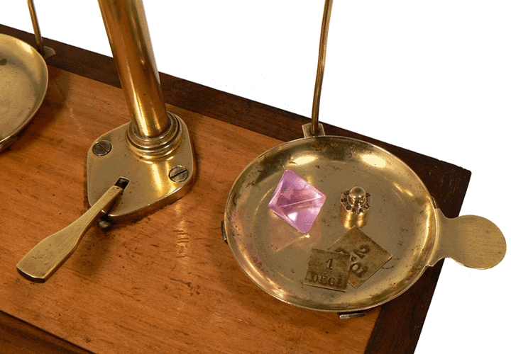 L'un des équilibres d'une double pesée réalisée pour déterminer la masse d'un cristal octaédrique. Ce cristal s'est formé à l'extrémité d'un fil très fin plongé dans une solution d'alun de potassium incolore et d'alun de chrome violet, soumise à l'évaporation. Vers 1955... |