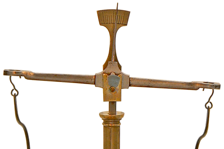 En appuyant sur la pédale située à la base de la colonne, on élève le fléau ce qui libère les plateaux. L'opération permet de vérifier l'état d'équilibre, comme par exemple ci-dessous, afin d'agir en conséquence... |