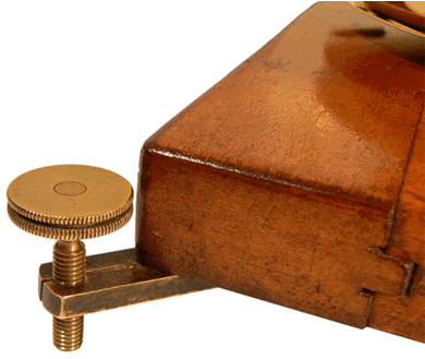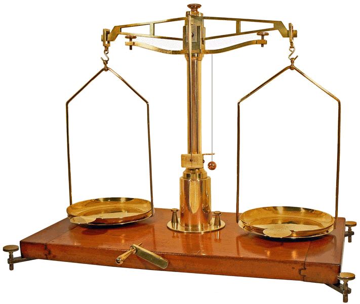 Avant une série de pesées, on procède au réglage de la direction verticale de la colonne en agissant sur les vis calantes situées aux quatre coins du socle de la balance. Le résultat est obtenu lorsque le fil auquel est suspendue une boule de laiton (on parle de "fil à plomb") est confondu avec l'axe vertical de l'ouverture circulaire d'une patte fixée à la colonne. |
