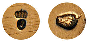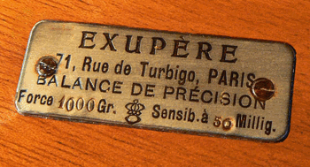 De part et d'autre du couteau central par lequel repose le fléau, on observe, à gauche, la marque de fabrique de la Maison EXUPÈRE consistant en un ovale surmonté d'une couronne et à droite, la marque de "vérification primitive" ou "marque première" laissée par le poinçon du bureau central d'étalonnage des Poids et Mesures. Cette marque "à la bonne fois" représente une poignée de main. |