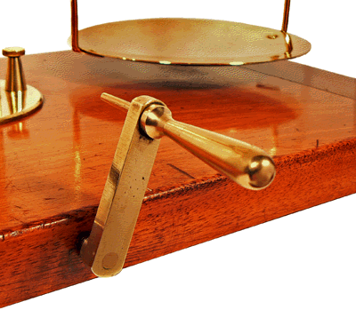 En faisant pivoter la manette vers la droite, on provoque l'élévation du fléau qui, jusque là, reposait sur les têtes de deux vis d'arrêt : l'arête du couteau central entre en contact avec son plan d'appui et les plateaux se soulèvent, entraînés par le mouvement. Le fléau et les plateaux sont libérés et il est alors possible de vérifier l'équilibre