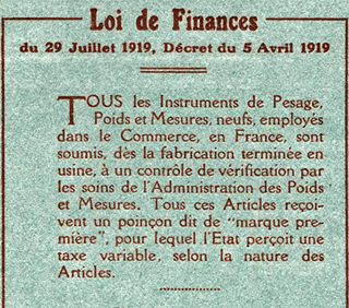 Sur la couverture du catalogue de la Maison EXUPÈRE, le texte du décret d'avril 1919 est suivi du montant de la taxe à verser à l'Etat "selon la nature des Articles" et qui sera "ajoutée au montant net de chaque facture". Par exemple, cette taxe est de 1 franc pour une balance de Roberval, 2 francs pour un trébuchet à 3 couteaux, 7 francs pour une bascule romaine de 200 à 1000 kg, 0,30 franc pour une masse en fonte de 500 g, 0,10 franc pour une masse en cuivre de 100 g ou encore 0,15 franc pour une subdivision de carat métrique... |