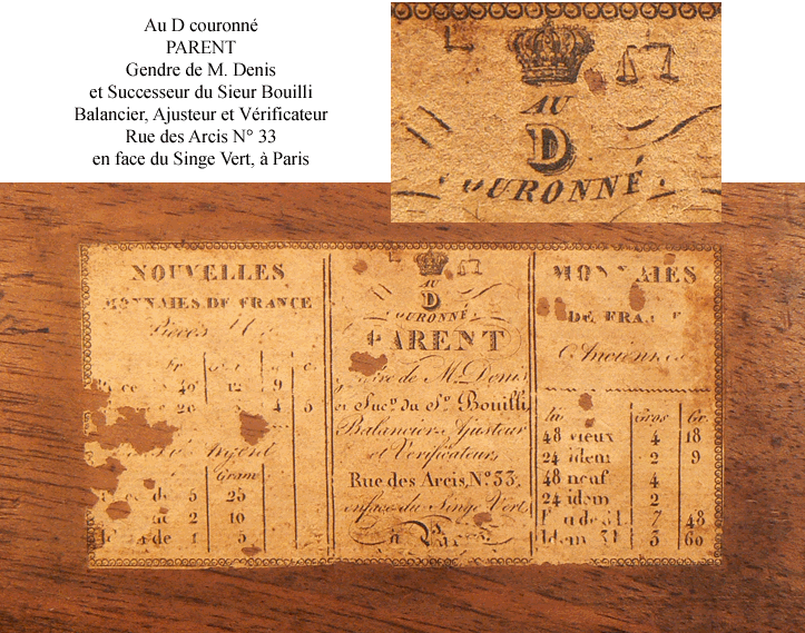 Dans son Dictionnaire des fabricants français d'instruments de mesure du XVe au XIXe siècle, Franck Marcelin situe Parent à l'adresse indiquée dans le coffret, c'est-à-dire au 33 rue des Arcis, entre 1819 et 1851, après qu'il eut repris l'affaire de Bouilli "Au D couronné". On rencontre d'ailleurs le balancier Parent, à cette même adresse, dans l'Almanach du Commerce de Paris de 1820 et, au moins, jusqu'en 1838. |