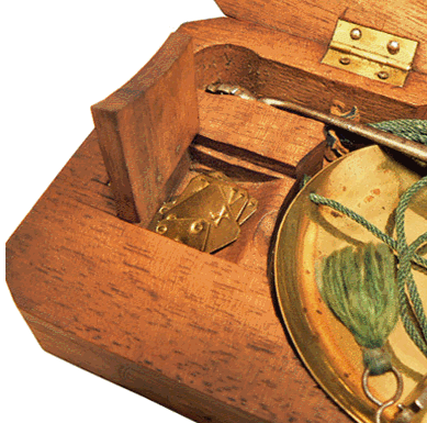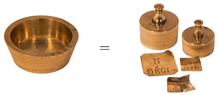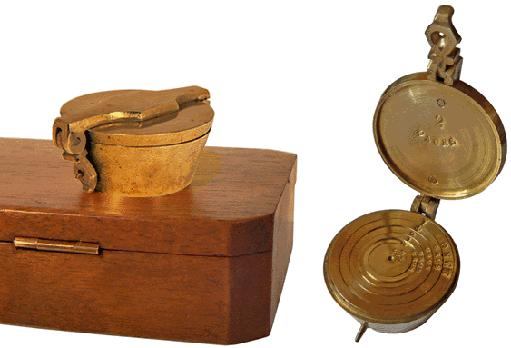 Dans le coffret, un petit compartiment protégé par un couvercle renferme des lamelles divisionnaires en cuivre. Ce sont des fractions d'once, c'est-à-dire des "grains" tels que l'on en recense 72 dans 1 gros, ou 576 dans 1 once. |