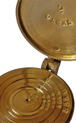 La pile de poids à godets a, lorsque son couvercle est refermé, une hauteur égale à 2 cm. Elle totalise 4 onces de l'Ancien Régime pour lequel l'unité de base est la livre de Paris ou "livre poids de marc" valant un peu plus de 489,5 g. L'once est la seizième partie de la livre de Paris, soit 30,59 g. Elle est elle-même divisée en 8 gros. |