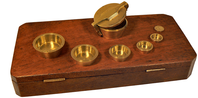 Le boitier vide pèse 2 onces. Devant lui, en partant de la gauche, les godets affichent les valeurs 1 once, 4 gros, 2 gros, 1 gros, puis deux fois 1/2 gros. L'ensemble permet de réaliser les poids de 1/2 gros jusqu'à 4 onces par bond de 1/2 gros. |
