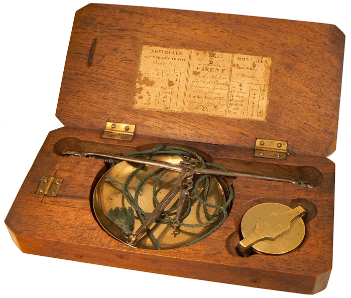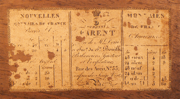 L'étiquette collée sur l'intérieur du couvercle du trébuchet indique les poids des anciennes monnaies de France en gros et grains et des nouvelles monnaies en grammes. L'instrument était utilisé aux fins de vérification des pièces d'or et d'argent qui devaient être "sonnantes", c'est-à-dire dont le métal tintait de façon particulière lorsqu'on les choquait, et "trébuchantes", donc présentant le "bon poids". |