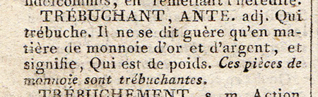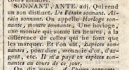 Les définitions du Dictionnaire de l'Académie française de 1798 (l'an VI de la République) renseignent sur le sens de l'expression, "espèces sonnantes et trébuchantes" : |