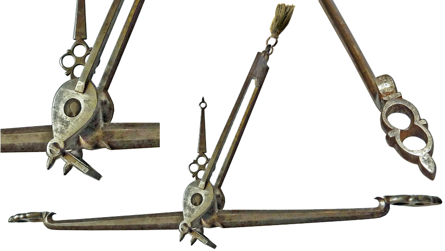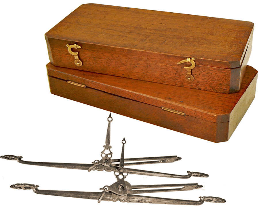 Un deuxième trébuchet Parent, de même taille, est rangé dans le Compendium. Les coffrets des deux spécimens ainsi que la plupart des éléments qu'ils contiennent c'est-à-dire les plateaux frappés au D couronné, les piles de poids à godets de 4 onces et les subdivisons en grains sont identiques. Les fléaux ainsi que leur aiguille et leur suspension, présentent la même qualité de finition, mais diffèrent par certains détails, en particulier le dessin de l'aiguille et le profil du fléau qui est arrondi chez l'un et hexagonal chez l'autre ... |