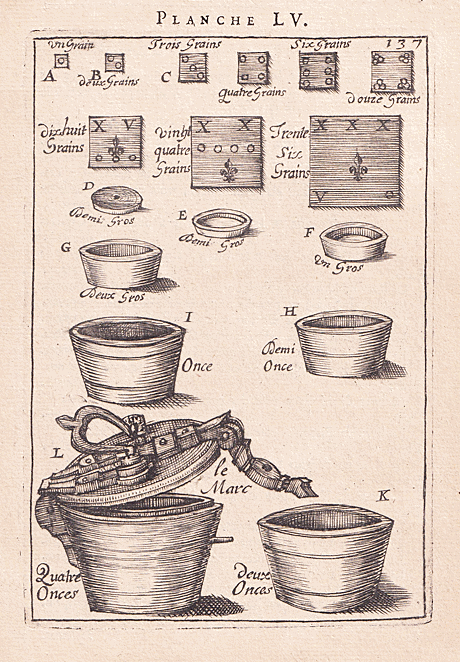 | Cette planche de 11 x16 cm est issue d'un ouvrage du début du XVIIIe siècle. Elle présente une série de poids constituée de godets et de lamelles divisionnaires, qui a précédé celle de notre page de plus d'une centaine d'années mais qui demeure tout à fait comparable. |