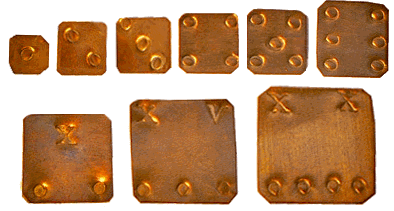 en chiffres romains (X, XV et XX) le nombre de points, ce qui aboutit à 12, 18 et 24 grains. |