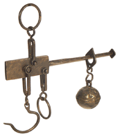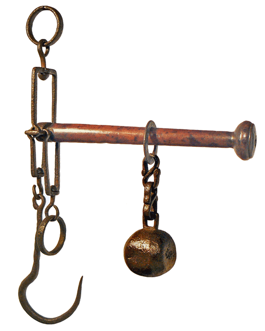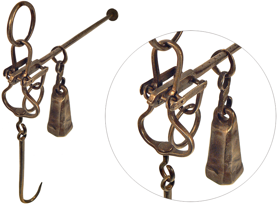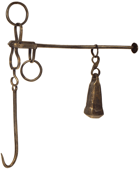 Le fléau de cette balance est en bois dur et mesure 22,5 cm. Un trèfle est frappé sur l'extrémité : il peut s'agir de la marque du balancier. Comme très souvent pour ce type de balance, deux capacités et donc deux sensibilités sont proposées suivant que l'instrument est suspendu par un anneau ou par l'autre. Le "côté fort" du grand bras de fléau correspond à la capacité la plus élevée et le "côté faible", à la capacité la plus faible. La photographie qui suit nous montre le côté faible permettant la pesée des objets de 1 à 16 livres. |