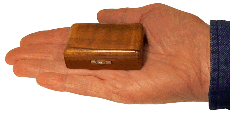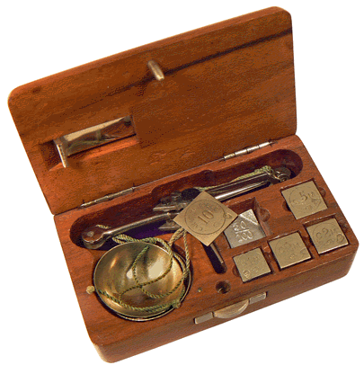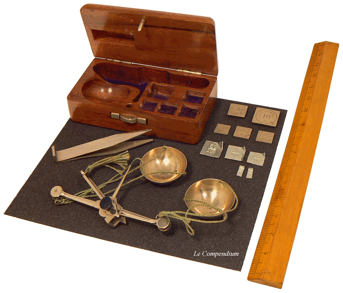 Le coffret en noyer mesure 6,5 x 3,5 x 2 cm. Il protège la petite balance, les poids en maillechort de 1, 2 fois 2, 5 et 10 carats métriques ainsi que quelques subdivisions en aluminium, marquées en "centièmes", qui se tiennent au fond du logement du poids le plus élévé. Un petite pince rangée dans le couvercle permet de manipuler ces poids. |