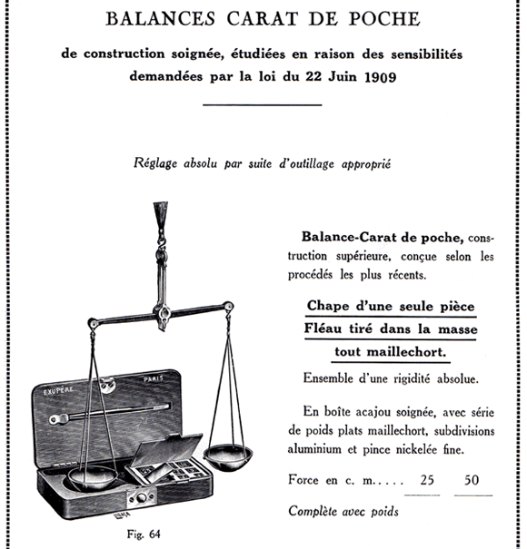 Au début du XIXe siècle, une balance "de fabrication nouvelle, étudiée en fonction des sensibilités demandées par la loi du 22 juin 1909" est proposée par la maison EXUPÈRE (Aubry et Georges, successeurs) sous une forme très voisine de notre modèle. La page qui suit est tirée du catalogue BALANCES et ACCESSOIRES de PRÉCISION pour le commerce des Diamants, Perles Fines et Pierres Précieuses de 1910. Notre coffret, qui ne porte aucune signature, est sans doute l'un des plus petits que l'on puisse rencontrer ... |