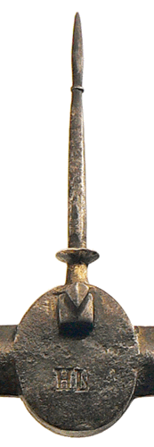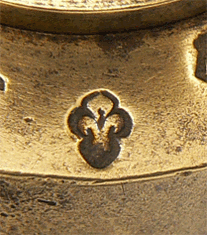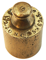 Le poids utilisé appartient à une boîte, malheureusement incomplète, signée CHARPENTIER, balancier au 73 rue Saint-Denis à Paris durant le premier tiers du XXe siècle et dont on voit la marque, le "P couronné" (CHARPENTIER est le successeur de POURIN, Balancier-Mécanicien), sur la photo de gauche. A droite, il s'agit de la marque du poinçon "à la fleur de lys" garantissant la vérification avant la mise en service. Cette marque a été remplacée en 1853 par la "marque à la bonne foi", représentée par une poignée de mains... |