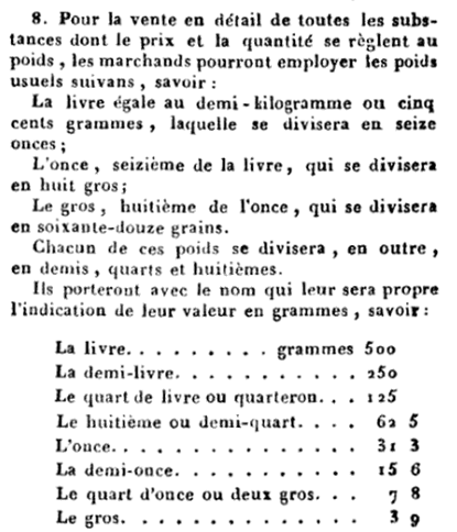 A droite, 2 onces ou 62,5 grammes, 8 onces ou 250 grammes, 2 livres ou 1 kilogramme, 1 livre ou 500 grammes, sont des "poids" dont l'usage a été autorisé par le décret du 12 février 1812 et jusqu'à fin 1839 afin - pensait-on - de favoriser l'admission du système métrique établissant l'uniformité des poids et mesures dans toute la France. Le décret de 1812 "allait directement contre le but qu'on voulait atteindre ; au lieu de rendre commun et populaire l'emploi du système métrique, il ne faisait que consacrer des habitudes déjà trop enracinées ; il augmentait même la confusion par le mélange des anciennes et des nouvelles mesures. On avait cru un peu légèrement que les anciennes mesures étaient plus en harmonie avec les besoins du peuple ; mais comme le faisait remarquer M. de ministre du commerce en présentant la loi à la Chambre des députés, le législateur de 1812 n'avait pas compris que c'étaient les habitudes du peuple et non ses besoins qui avaient résisté à l'admission du système métrique. " On reconnaît facilement, disait-il, en y réfléchissant, que la division de l'unité de poids, par exemple, en 16 onces, ne correspond pas davantage, absolument parlant, aux besoins de l'homme du peuple que la division en 250 grammes, et qu'il suffit d'une habitude contraire pour qu'il exprime directement et sans traduction son besoin du moment par des sous-multiples décimaux du demi-kilogramme, tout aussi bien que par des divisions binaires de la livre." (...)" - (Collection des lois, décrets, ordonnances, règlements et avis du Conseil d'Etat - année 1837) |