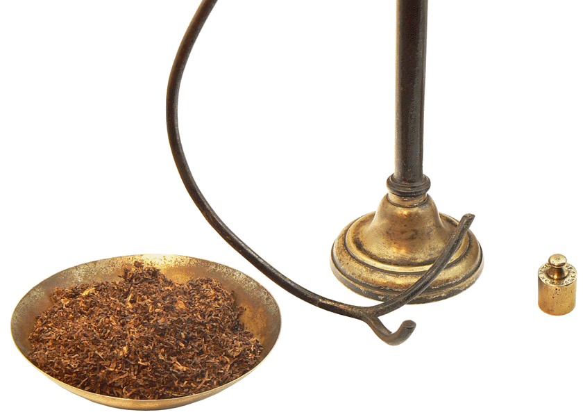 L'opération consiste à prélever 2 onces de tabac. Le poids de 2 onces est placé dans l'une des coupelles et le tabac est ajouté peu à peu dans l'autre jusqu'à obtention de l'équilibre. Il s'agit, là, d'une simple pesée... |