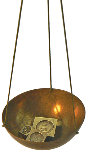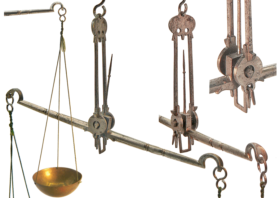 Les coupelles de 3,7 cm de diamètre sont prêtes à recevoir diamants, perles fines ou pierres précieuses pour l'une d'elles et masses marquées en carat, les "poids carats", pour l'autre... |