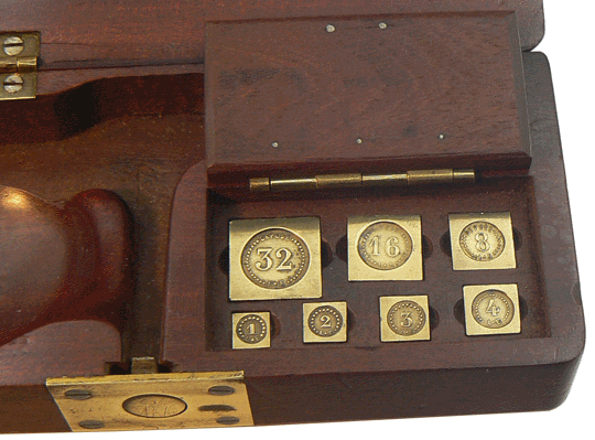 La boîte renferme des "poids carats" en forme de pyramide quadrangulaire tronquée. Leur valeur est exprimée en carat de 205 mg. Ce carat, que l'on appelle maintenant carat ancien, a été remplacé par le carat métrique défini par la 4ème conférence des poids et mesures de 1907 et seul autorisé à partir de juin 1909 : il correspond à 200 mg. Notre coffret a dû être utilisé pendant la période transitoire et était peut-être accompagné du "Barême" édité par la maison Exupère et permettant de réaliser facilement les conversions d'une unité à l'autre. Le carat ancien de 205 mg est, en effet, divisé en 64 parties alors que le carat métrique de 200 mg, assujetti à la division décimale est divisé en 100 parties. |