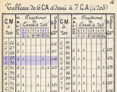 Ce résultat peut, en fait, être rapidement obtenu en utilisant le barême. A gauche, nous avons reproduit une partie de la page 18 et colorié les zones intéressantes pour l'exemple choisi. La ligne horizontale correspondant à 6 c.a 1/2, 1/32, nous donne la valeur totale égale à 418/64 et se profile entre 6,69 et 6,70 c.m. L'écart devant toujours être au profit de l'acheteur, on retient la valeur 6,69 c.m comme résultat de la pesée... |