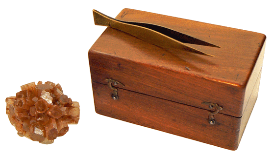 Près de la petite boîte de poids totalisant 100 grammes, l'aragonite, jolie pierre brute, utilisée pour tester notre trébuchet lors d'une simple pesée. Elle pèse 29,10 grammes. |