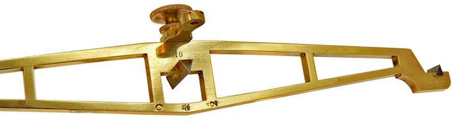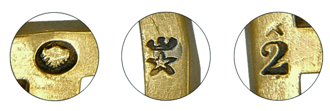 Trois symboles de petite taille - chacun mesure un peu plus d'un millimètre - sont frappés sur la traverse basse du fléau. A gauche, la marque du poinçon de "vérification primitive" apposée par le service des poids et mesures avant la mise en circulation de l'instrument : il s'agit de l'empreinte "à la bonne foi" représentée par une poignée de main. Au centre, une étoile à 5 branches couronnée. marque de Trayvou que l'on rencontre sur le Registre relatif à l'insculpation des fabricants de poids et mesures à partir de 1867. L'insculpation consiste en l'inscription au registre avec dépot d'une plaque frappée à la marque du constructeur. Benoît Trayvou a succédé en 1865 à Joseph Béranger, celèbre pour les améliorations apportées à la balance Roberval dans ses usines de La Mulatière, près de Lyon. Enfin le 2 qui, surmonté d'une étoile mal frappée est plus mystérieux...Il peut s'agir du numéro d'ordre du bureau vérificateur : il correspond, en effet, à celui de Lyon. |