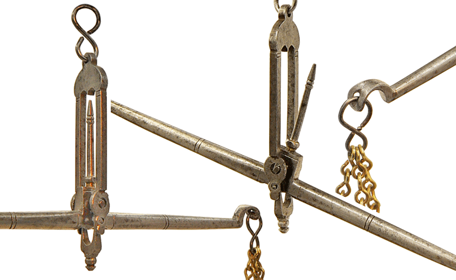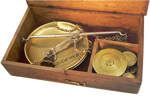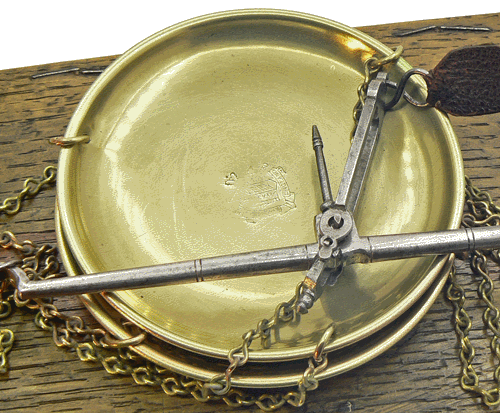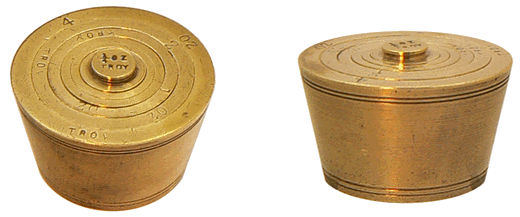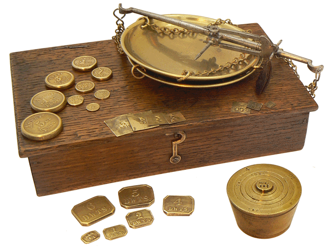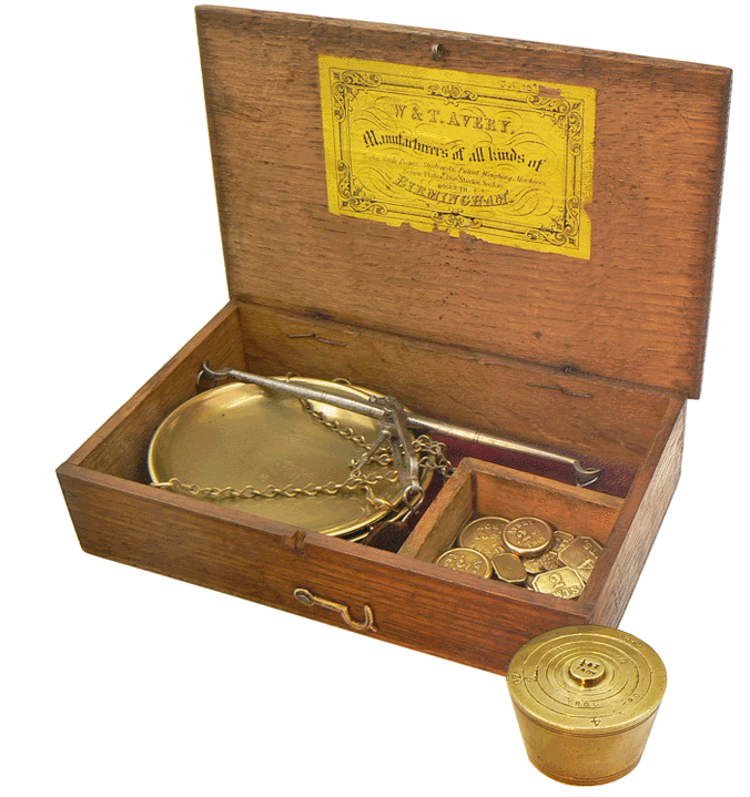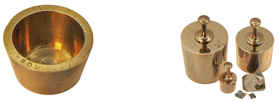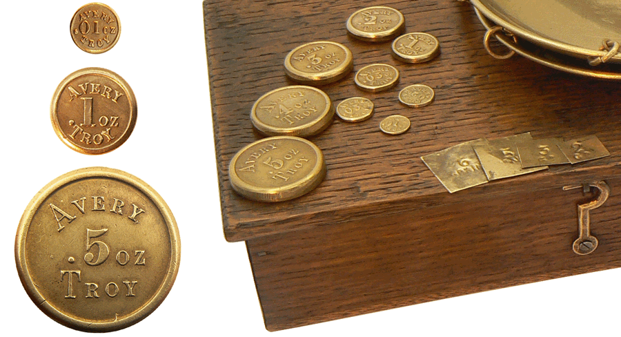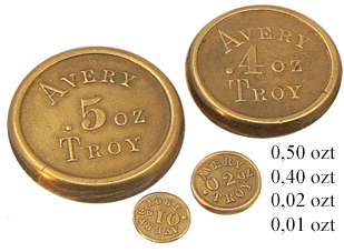 La balance est accompagnée d'un ensemble de poids troy utilisés pour les métaux précieux et pour les diamants. Les spécimens présents sont exprimés en onces troy, pennyweights et grains. L'once troy (de symbole ozt) correspond à environ 31,103 grammes. Une livre troy (lbt) vaut 12 onces troy. On retrouve ces valeurs avec les poids que les apothicaires utilisaient dans la fabrication des médicaments (apothecaries' weight). |