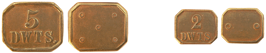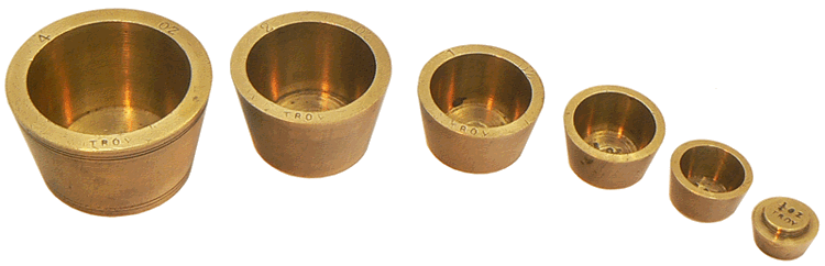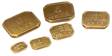 Quelques poids sont marqués en pennyweiths. Le pennyweith, dont le symbole est DWT vaut 24 grains ou 0,05 once troy. |
