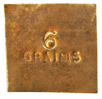 Toujours sur le coffret, mais à droite, on remarque quatre lamelles marquées en grains, telles que 1 once troy = 480 grains. Elles sont semblables à la lamelle de 6 grains photographiée ci-contre et dont le côté est de 2 cm. |
