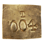 Trois subdivisions marquées".001", ".002" et ".004" sous la lettre T, terminent la collection de poids qui accompagnent le trébuchet. La plus grande des trois est représentée à gauche. Elle mesure une douzaine de millimètres et pèse entre 120 et 125 mg. Ce résultat peut faire penser que l'indication 004 est l'expression de sa masse en millièmes d'once troy... 0,004 T = entre 120 et 125 mg |
