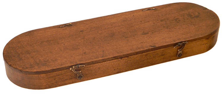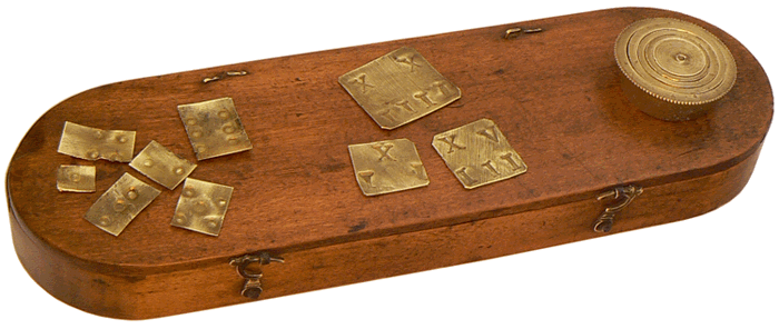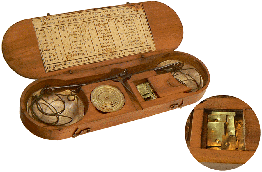 Le coffret en noyer, de 17 x 5 x 2 cm, renferme le trébuchet monétaire, une pile de poids à godets de 1 once et, dans une petite trappe à couvercle coulissant, une série de lamelles divisionnaires marquées en grains, de 1 à 24 grains. |