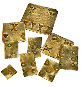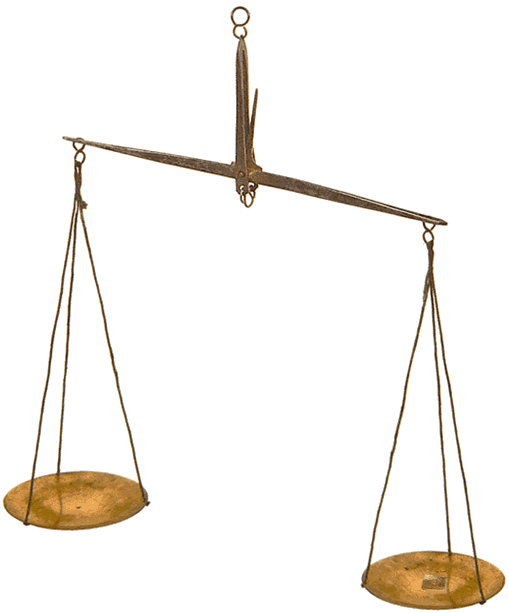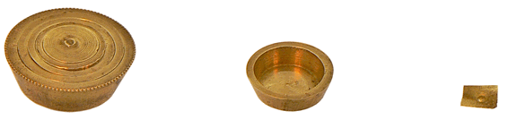 La pièce, de 37 mm de diamètre, est placée sur le plateau de gauche. Il est nécessaire, pour que le fléau revienne au plus proche de sa position d'équilibre à vide, de déposer sur le plateau de droite les godets de 4 et 2 gros, la pastille centrale de 1/2 gros et la lamelle de 2 grains. Notre pièce pèse 6 ½ gros, 2 grains. |