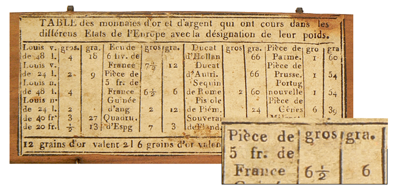 Sur l'intérieur du couvercle du coffret, la table des monnaies d'or et d'argent renseigne sur le poids, en gros et grains, des différentes pièces, dont celle de 5 fr. de France... |