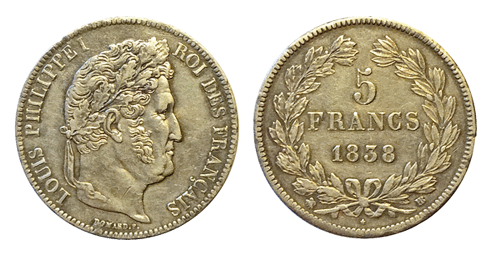 Nous pesons cette pièce de 5 francs de 1838, pièce en argent à l'effigie de LOUIS PHILIPPE I et dont la tranche porte les mots "DIEU PROTEGE LA FRANCE". |