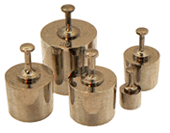 Les poids octogonaux et très légèrement ventrus, ne portent aucune indication de leur valeur mais sont repérés par un certain nombre de points frappés sur leur base. Les plus gros sont marqués par 1, 2, 3 et 5 points et cinq autres par 1, 2, 3 (pour 2 d'entre eux de même valeur) et 4 points. Nous avons déterminé la masse de chacun d'eux, avec une précision du décigramme, sans tenir compte du plus petit, trop oxydé pour prétendre à un résultat significatif. L'image qui suit montre l'équivalence entre le gros poids frappé de 1 point et les masses marquées de précision utilisées. |