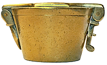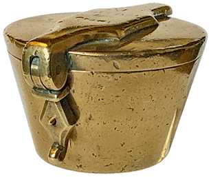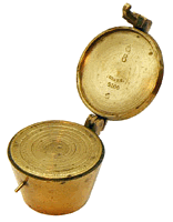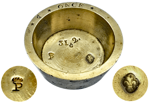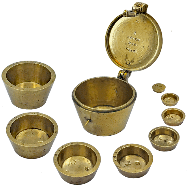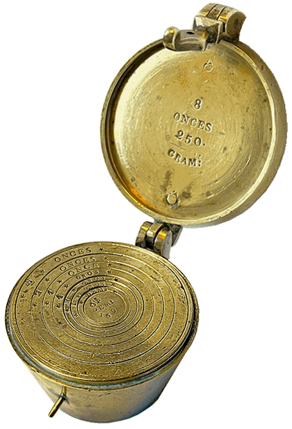 Sept godets et une pastille centrale, totalisant 8 onces, sont contenus dans un boîtier marqué 8 onces. L'ensemble, de 16 onces, correspond à 1 livre métrique de 500 grammes telle qu'elle est définie par le décret impérial du 12 février 1812 relatif aux poids et mesures et non, comme jusqu'alors, à la livre de l'Ancien Régime, livre du poids de marc, ou livre de Paris, équivalant à 489,5 grammes. Ce décret instaure en effet, durant la période de mise en place du système métrique, l'utilisation des noms des subdivisions de la livre de l'Ancien Régime, l'once, le gros et le grain, pour nommer les fractions de la livre de 500 grammes. |
