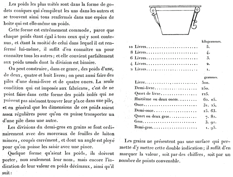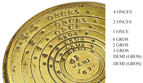 L'encadré qui suit est réalisé à partir du "RECUEIL D'INSTRUCTIONS SUR LES POIDS ET MESURES, imprimé par ordre de Son Excellence LE COMTE CORBIÈRE, Ministre de l'Intérieur, pour être adressé à tous les Départements" (1827). Il fait référence au décret impérial du 12 février 1812 pour ce qui concerne les noms des subdivisions de poids et de leur valeur exprimée en grammes. Une différence toutefois, l'Arreté pour l'exécution du décret (BnF Gallica) donne les valeurs avec la précision du dixième de gramme. |