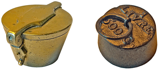 Le nom de livre sera conservé en tant que synonyme des 500 grammes : il figurera longtemps sur les poids "en fer", semblables à celui que nous avons placé près de la pile à godets, afin de la différencier de la livre de l'ancien régime correspondant à 489,5 grammes. |