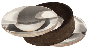 La monture renferme deux lentilles biconvexes fines, maintenues écartées l'une de l'autre par une bague en bois qui joue également le rôle de diaphragme en arrêtant les rayons qui s'écartent trop de l'axe principal. La disposition, qui consiste à utiliser deux lentilles de courbures moindres plutôt qu'une seule lentille plus épaisse, donc plus convergente, réduit les aberrations et permet obtenir, pour un même grossissement, des images moins irisées sur les bords. Le diamètre du modèle présenté est égal à 4,5 cm. |