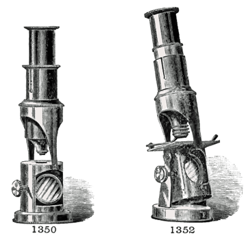 A la fin du XIXe siècle et dans son catalogue OPTICAL AND METEOROLOGICAL INSTRUMENTS, la société américaine B. KAHN & SON propose le modèle inclinable "Arcade" (ref. 1352) muni d'un objectif composé de 3 lentilles permettant des grossissements de 40, 60 et 80 fois pour un montant de 5,00 $. A gauche, le modèle de base, "Boys' microscope" (ref. 1350), droit et au grossissement unique égal à 40 fois coûte 2,50 $. Les deux instruments sont livrés en coffret verni, avec une préparation, deux lames vierges et une pince. |