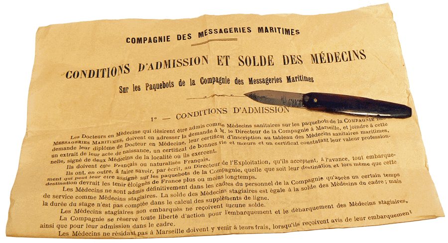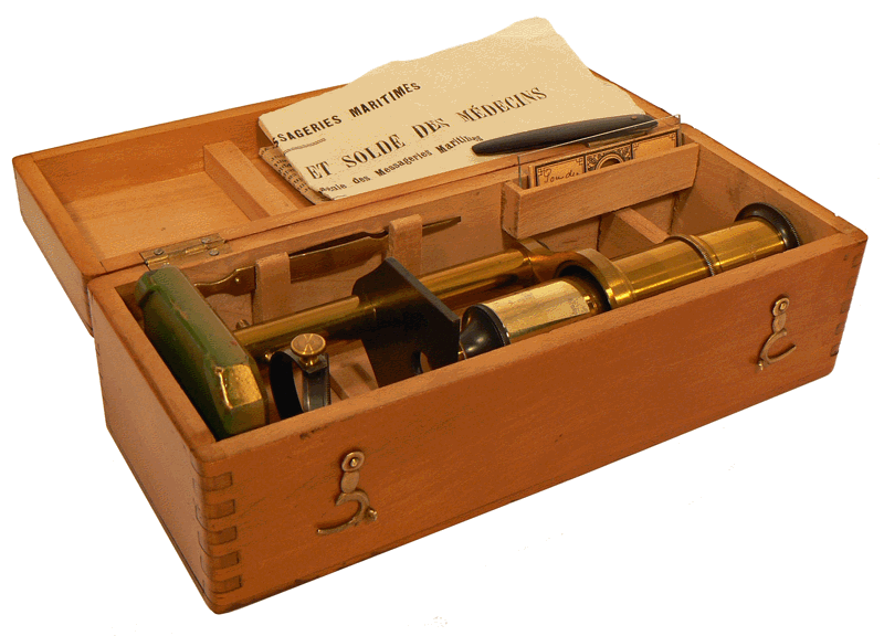 Curieusement, le coffret renferme une notice du 4 août 1910 de la Compagnie des Messageries Maritimes destinée aux candidats médecins ainsi qu'une petite lancette pliante à manche en écaille signée Chartier. Il semble peu probable qu'un tel microscope ait été utilisé par un praticien si ce n'est, et pourquoi pas, afin de mettre en évidence les parasites, poux, puces et autres sarcoptes ..., qui ne devaient pas manquer à bord. Ces petits animaux ne nécessitent pas de forts grossissements pour nous montrer les détails de leur anatomie. Mais, ce n'est qu'une supposition parmi les multiples explications possibles et plus vraisemblables ... |