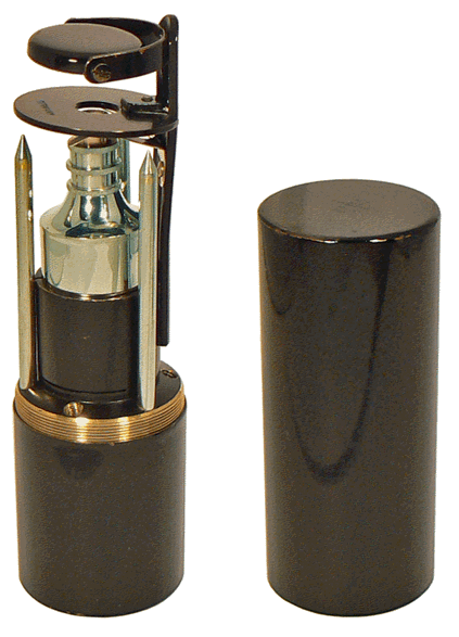Le microscope est protégé par un solide étui de 14 x 4 cm, en laiton laqué noir. Les deux parties de l'étui se vissent sur une épaisse bague filetée solidaire de l'appareil. La plus petite partie de l'étui porte la marque du fabricant allemand : |