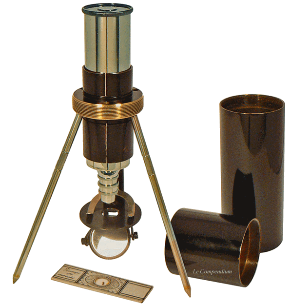 Les différentes parties du microscope sont en laiton nickelé ou laqué noir. Sa hauteur minimum est égale à 15 cm. Le diamètre de la platine circulaire ne dépasse pas 3,5 cm. L'utilisation des lames porte-objet standard est pratiquement impossible et il faut se contenter de petites lames si l'on ne veut pas être gêné par l'étroitesse de la platine ainsi que par les deux jambes formant l'avant du support. |